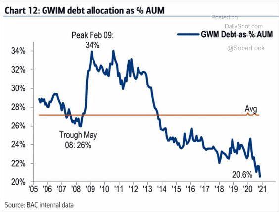 As indicated by Global Wealth & Investment Management (GWIM), bonds as a percentage of total investor allocations has not been lower for at least the past 15 years.