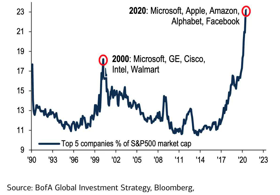 As we have discussed in the past, the once diversified stock index has grown increasingly concentrated, mirroring the disparity between Main Street and Wall Street south of our border. In fact, at no other time in history have five stocks dominated the S&P500 more than these five do today.