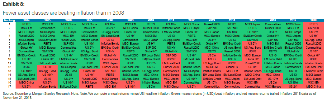 The chart below highlights investments that have outperformed inflation in green and those that have trailed in red for every year since 2004. As you can see, not a single asset class has managed this feat thus far in 2018 whereas there were at least four places to hide in 2008, predominantly in US bonds.